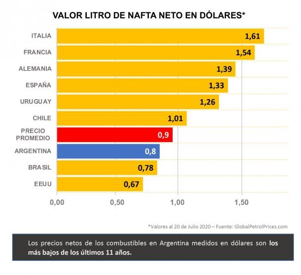 En Italia, por ejemplo, el litro de nafta representa u$s 1,61; en España u$s 1,33; en Uruguay u$s 1,26 y en Chile u$s 1,01. En la Argentina, el litro de nafta se paga u$s 0,8 y está por debajo del promedio que es u$s 0,9.