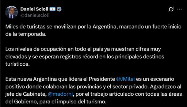 "Esta nueva Argentina que lidera el presidente Javier Milei es un escenario positivo donde colaboran las provincias y el sector privado. Agradezco al jefe de Gabinete, Manuel Adorni, por el trabajo articulado con todas las áreas del Gobierno, para el impulso del turismo", agregó.