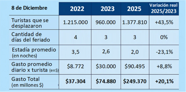 El último fin de semana largo del 2025 trajo consigo un aumento en la cantidad de turistas que recorrieron el país, aunque con una estadía menos extensa con relación al mismo período de 2023 (el año pasado el Día de la Inmaculada Concepción cayó en domingo y no hubo puente turístico).