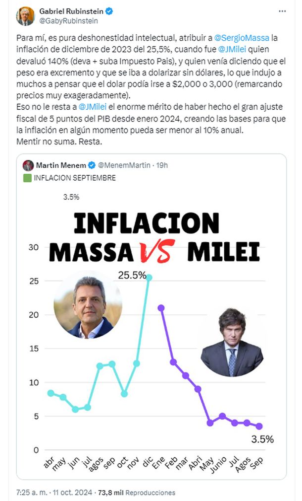 "Para mí, es pura deshonestidad intelectual, atribuir a Sergio Massa la inflación de diciembre de 2023 del 25,5%, cuando fue Javier Milei quien devaluó 140% (deva + suba Impuesto Pais), y quien venía diciendo que el peso era excremento y que se iba a dolarizar sin dólares, lo que indujo a muchos a pensar que el dolar podía irse a $2,000 o 3,000 (remarcando precios muy exageradamente)", escribió el exfuncionario en su cuenta de Twitter.