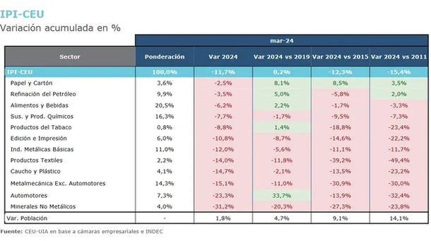 Se trató del décimo mes de caída seguido y el primer trimestre de 2024 acumuló una baja interanual de -11,7%. Los índices anticipados de abril reflejan que persiste la caída interanual, aunque podría observarse una leve mejora frente a marzo, que estuvo en un nivel extremadamente bajo.