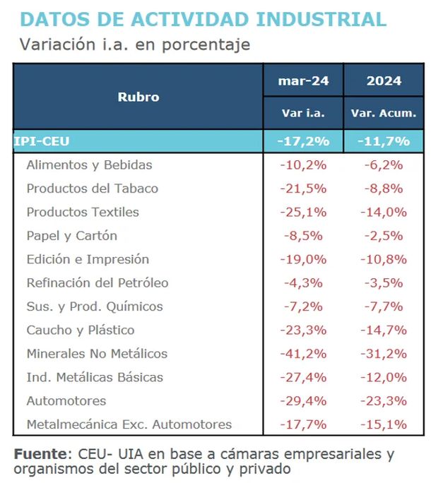 La industria argentina va camino de un año de caída ininterrumpida por la fuerte baja en la demanda de bienes, por la pérdida de poder adquisitivo. De acuerdo con la Unión Industrial Argentina (UIA), en marzo la actividad registró una caída en la comparación anual (-17,2%) y mensual (-4,7%).