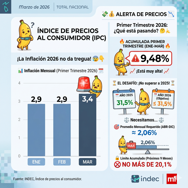 El Instituto Nacional de Estadística y Censos (INDEC) publicó el nuevo índice de precios y la inflación 2026 ya acumula un 9,48% en el primer trimestre. Tras registrar un sorpresivo 3,4% en marzo, el Gobierno nacional analiza minuciosamente los números necesarios para no sobrepasar el índice total del año pasado.