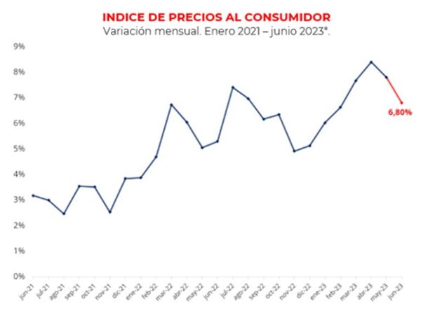En concreto, calcula el índice de precios al consumidor (IPC) de junio en 6,8%, resultado que por segundo mes consecutivo marcaría una desaceleración en la tasa mensual de inflación, por debajo del 7,8% registrado en mayo tras el 8,4% de abril pasado.