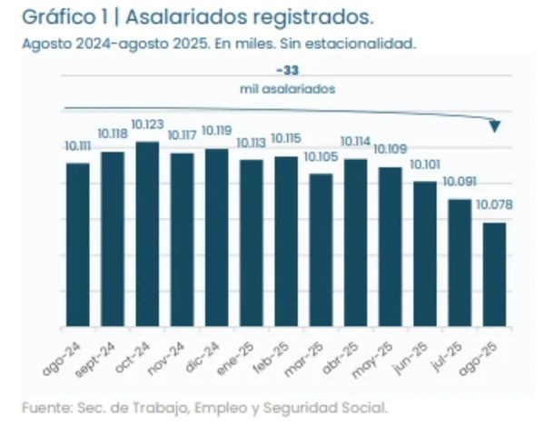 El informe señala que el sector privado registrado, con 6,23 millones de empleos, volvió a caer y alcanza un nivel comparable al de agosto de 2018, lejos del pico de agosto de 2023.