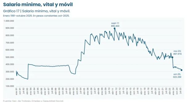 El salario mínimo, vital y móvil tuvo en octubre una nueva caída real (-2,3%) y acumula 35% de pérdida desde noviembre de 2023. Su valor real es hoy inferior al de 2001 y representa solo un tercio del máximo alcanzado en 2011.
