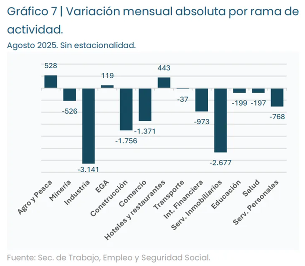 Las caídas más significativas se dieron en intermediación financiera (-0,7%), seguida de la minería (-0,6%), y construcción (-0,5% mensual). En el otro extremo, Agro y Pesca, Suministro de Electricidad, Gas y Agua y Hoteles, y Restaurantes fueron los únicos sectores con una variación positiva (del +0,2%), mientras que Industria y Servicios Inmobiliarios lideraron la caída del empleo en términos absolutos.