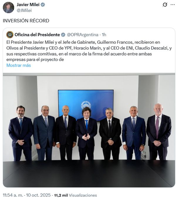 Javier Milei fue el que mantuvo una reunión con Horacio Marín, titular de la compañía estatal, y su par de ENI, Claudio Descalzi, en la Quinta Presidencial de Olivos. Además, Guillermo Francos, jefe de Gabinete, también estuvo presente.