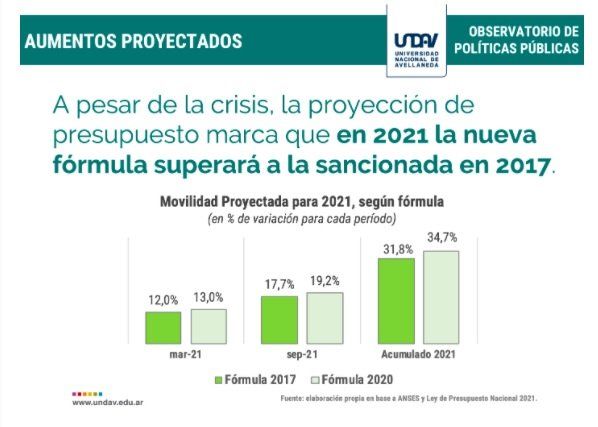 "En términos acumulados, la movilidad calculada en base a la Nueva Fórmula brindará un aumento del 34,7%, ubicándose 3 puntos porcentuales por encima al 31,8% que hubiese otorgado la Fórmula macrista" indica la Undav.