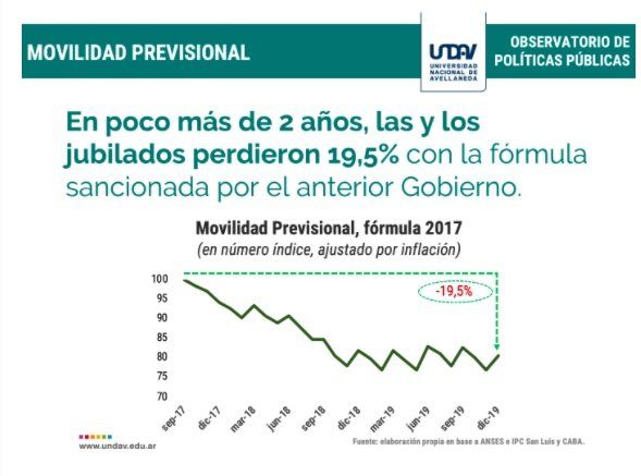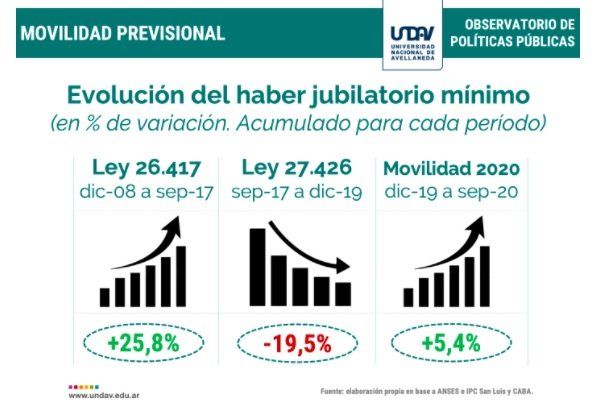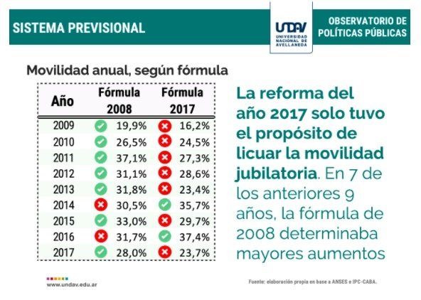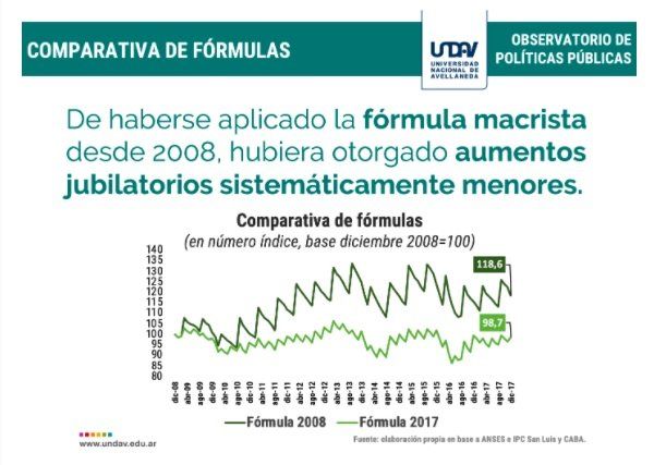 El último informe de la Universidad Nacional de Avellaneda (Undav) señala que "entre diciembre de 2008 y diciembre de 2017, los haberes jubilatorios se incrementaron un 18,59% en términos reales, gracias a la aplicación de la fórmula de 2008. En cambio, si hubiese aplicado la fórmula de 2017, los mismos hubieran perdido 1,31% de poder adquisitivo".