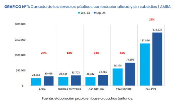 El informe indica que durante septiembre un hogar promedio, sin subsidios, destinó $173.625 para cubrir necesidades de energía, agua y transporte, cifra que representa una disminución del 7,7% respecto al mes anterior por factores estacionales, aunque es un 26% superior a la del mismo mes de 2024.