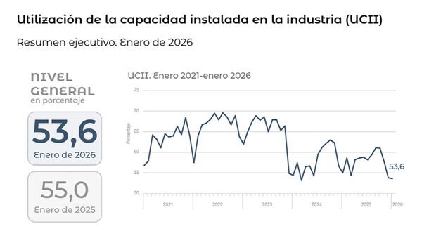 En concreto, la industria manufacturera utilizó apenas el 53,6% de su capacidad instalada durante el primer mes del año, guarismo inferior al del mismo mes de 2025, cuando era de 55%. Además, representó el peor inicio de año para el sector desde la profunda crisis socioeconómica de 2002.