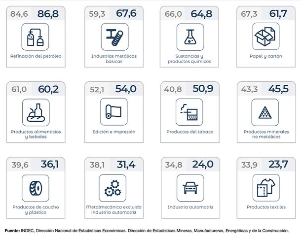 Otras industrias profundamente afectadas por las políticas económicas implementadas por la gestión de Javier Milei fueron la textil (desde el 33,9% al 23,7%) y la metalmecánica, cuya utilización de capacidad instalada descendió desde el 38,1% hasta el 31,4%.