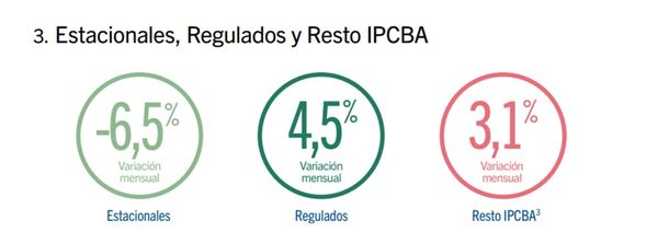 Así, frente a la disparada de los regulados, la desaceleración del índice de inflación general se explica principalmente por la fuerte caída del 6,5% de los precios estacionales, principalmente por las bajas en los precios de los pasajes aéreos, las tarifas del alojamiento en hoteles y en los valores de los paquetes turísticos. Por otra parte, los regulados aumentaron 4,5%, por suba en las tarifas de electricidad y de gas por red, junto con subas de las cuotas de la medicina prepaga y en el boleto de colectivo.