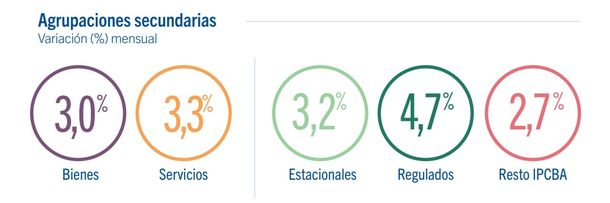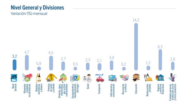 Le siguen "Vivienda, agua, electricidad, gas y otros combustibles" que registró un incremento del 2,7%; "Salud" (2,3%) y "Transporte" (2,1%).