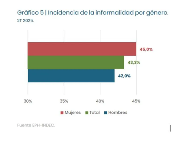 El análisis por género y edad también arroja conclusiones relevantes. En la mayoría de los tramos etarios, la informalidad femenina supera a la masculina. Sin embargo, existe una excepción clara: el grupo de jóvenes de entre 16 y 24 años. Allí, los hombres presentan la tasa más alta de informalidad de todos los segmentos analizados, con un 67,3%. En el extremo opuesto se ubican los hombres de entre 45 y 65 años, que registran la menor tasa, con un 33,7%.