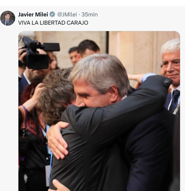 Y luego posteó una foto abrazando a Luis Caputo, con la frase "VIVA LA LIBERTAD CARAJO".
