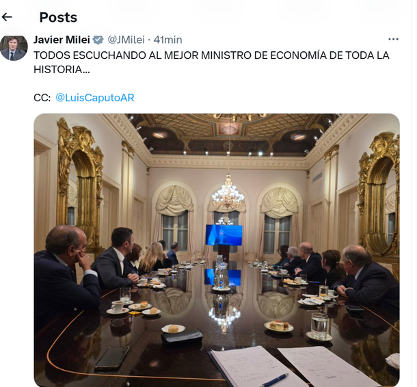 La primera reacción del presidente investigado por el presunto delito de estafa por la cripto LIBRA, fue escribir en sus redes "TODOS ESCUCHANDO AL MEJOR MINISTRO DE ECONOMÍA DE TODA LA HISTORIA... " y de fondo una foto junto a su gabinete con un televisor de fondo.