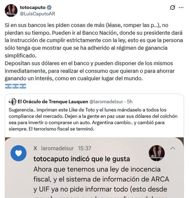 El ministro escreibió ese texto al retuitear otra publicación de un usuario que decía: “Ahora que tenemos una ley de inocencia fiscal, el sistema de información de ARCA y UIF ya no pide información, espero que los complance del mercado no rompan más las pelotas a todos los ahorristas que quieren invertir unos dólares en negro, no rompan más”.