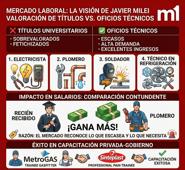 Para graficar la ventaja económica de dedicarse a estas tareas, el jefe de Estado lanzó una contundente comparación salarial. "En la Argentina, hoy, un plomero, de hecho, gana más que alguien recién recibido", sentenció ante los presentes. Según su razonamiento, este fenómeno ocurre debido a las señales de precios, ya que el mercado "reconoce lo que escasea y lo que necesita" de manera urgente.