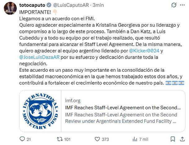 El posteo de Luis Caputo con el anuncio de un nuevo acuerdo con el FMI