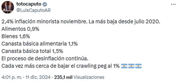 El ministro de Economía, Luis Caputo, expresó su satisfacción tras conocer los datos de inflación correspondientes a noviembre, divulgados por el Instituto Nacional de Estadística y Censos (INDEC). Según el informe, el Índice de Precios al Consumidor (IPC) tuvo un índice del 2,4% en el mes de noviembre, lo que fue interpretado como una señal positiva por parte del Gobierno, que se enfoca en la reducción de la inflación tras un largo período de altos aumentos.