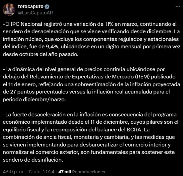 De esta manera, el Gobierno celebra una baja que los ciudadanos aún no registran en su bolsillo. Pero más allá de que la realidad parece no coincidir con los porcentajes, el ministro de Economía Luis Caputo publicó un extenso mensaje en X para destacar que, en realidad, la inflación fue del 9,4% y así llevarse el crédito de que resultó ser de un solo dígito.