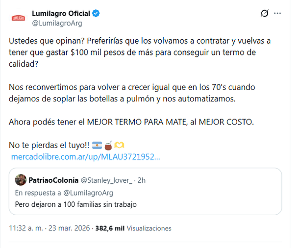 La cuenta oficial de Lumilagro, la emblemática empresa argentina fabricante de termos, desató indignación tras una repudiable respuesta de su Community Manager (CM) en la plataforma X (ex Twitter) en la que justificaba despidos. Las estrategias para llamar la atención en las redes sociales pueden ser un arma de doble filo.