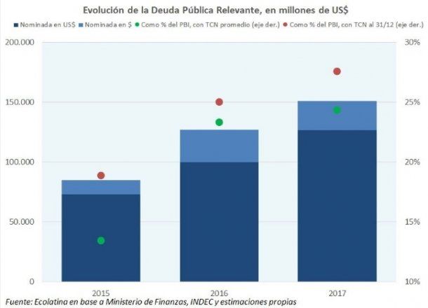 Una de las políticas económicas que más se modificó desde que asumió el gobierno de Cambiemos fue el mix de financiamiento del déficit fiscal. Según un trabajo de la consultora Ecolatina,la deuda pública relevante casi se duplicó entre 2015 y 2017, pasando de u$s 85.000 millones, a poco más de u$s 150.000 millones al cierre del año pasado.