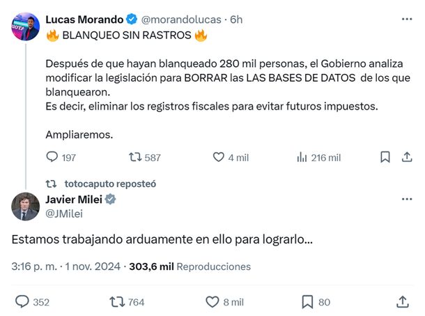 Además, el gobierno de Javier Milei analiza impulsar modificaciones legislativas para eliminar la base de datos de quienes ingresaron al blanqueo de capitales, lo que representa eliminar los registros fiscales para evitar futuros impuestos.