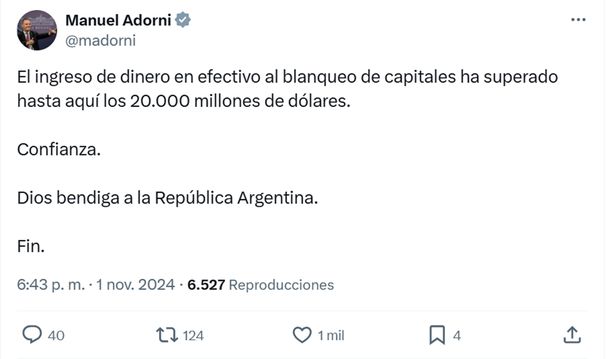 “El ingreso de dinero en efectivo al blanqueo de capitales ha superado hasta aquí los 20.000 millones de dólares. Confianza. Dios bendiga a la República Argentina. Fin”; publicó en la red social X el vocero presidencial.