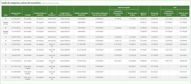 • Categoría A: ingresos brutos de hasta $ 2.108.288,01 anual, pagarán $12.128,39 por mes