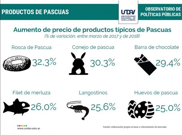 En promedio, los distintos productos aumentaron 25,2% en el último año. Entre las subas más importantes aparece el chocolate en barra (+29,4%), el salmón (+27,2%) el filet de merluza (+26,0%) y el huevo de pascua (+25%). Mientras que los que aumentaron menos son: el camarón (+24%), el conejo de pascua (+23,7%), la rosca de pascua y los langostinos (estos dos últimos productos se encarecieron 23,0%).