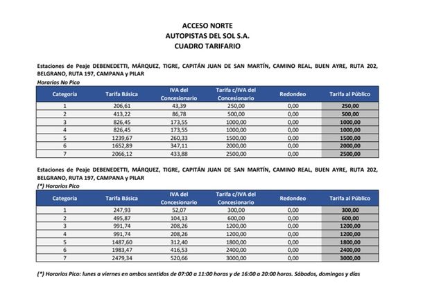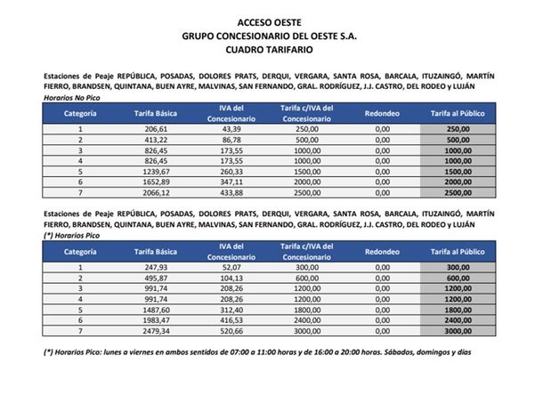 De esta forma, las tarifas del peaje para la categoría 2 (autos) en los accesos Norte y Oeste pasaría a 600 pesos en horas pico y a 500 pesos en horas no pico.