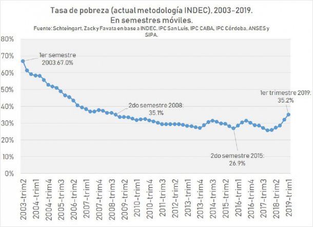 El macrismo habría creado unos 4 millones de nuevos pobres desde que llegó al poder a fines de 2015, con un total de 35.2% en 2019 o 19 millones de personas, de acuerdo con un estudio del sociólogo Daniel Schteingart y los economistas de la Universidad de San Martín Guido Sack y Federico Favata.