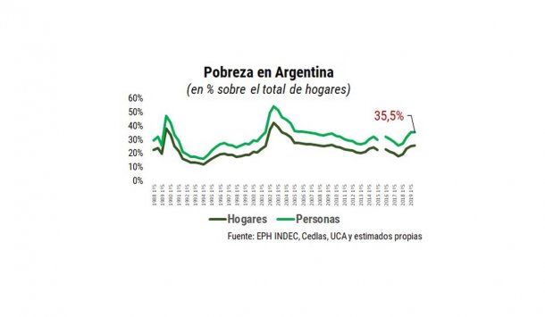 En octubre de 2002, el país se sumergió en su situación más crítica: el 57,5% de la población (unas 19,3 millones de personas en aquel entonces) eran pobres. Es, hasta el momento, el registro más alto de la tasa de pobreza desde la medición de este indicador que realiza el Indec desde 1988.