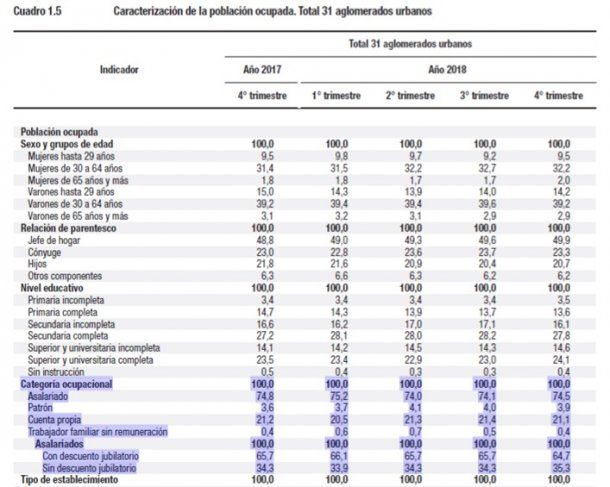 Hay dos datos centrales que llamaron la atención de los analistas: la caída de la población ocupada y el aumento del trabajo no registrado. Estas dos condiciones hicieron que la tasa de desempleo aumentara 2 puntos porcentuales en un año pero, a la vez, subiera "sólo" eso y no fuera más alto el índice de desempleo.