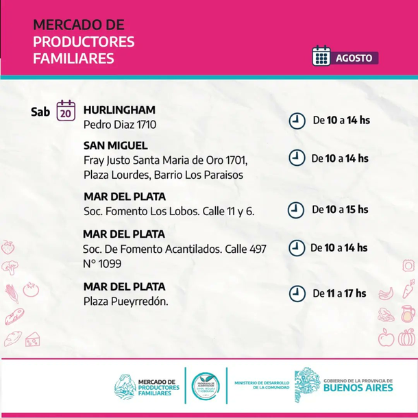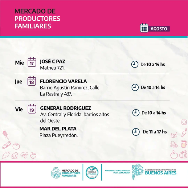 El Gobierno bonaerense dio hoy a conocer los lugares donde funcionarán esta semana los Mercados de Productores Familiares, en los que se podrán comprar carne, verduras, frutas, lácteos y pan a precios populares. Hay además descuentos con Cuenta DNI.