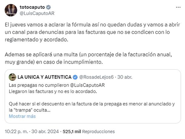 El mensaje del ministro fue en respuesta al reclamo de una ciudadana por el incumplimiento de las prepagas a la medida de retrotraer los precios de sus cuotas al de diciembre 2023 y, a partir de allí, incrementar por el Índice de Precios al Consumidor de los meses posteriores: “Llegaron las facturas y no es lo acordado”, fue la queja.