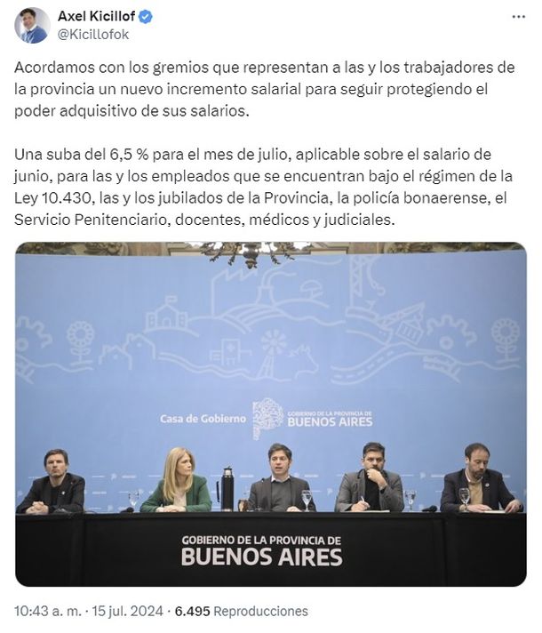 El gobernador de la provincia de Buenos Aires, Axel Kicillof, , junto al ministro de Economía bonaerense, Pablo López, anunciaron este lunes un aumento salarial del 6,5% para los empleados estatales, aplicable sobre el salario de junio, tras un acuerdo con los gremios. Incluye a todos los empleados que se encuentren bajo el régimen de la Ley 10.430, jubilados, policía, Servicio Penitenciario, docentes, médicos y judiciales.