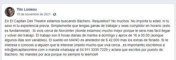 En noviembre de 2021, ofrecía 42 mil pesos netos para un bachero. La Canasta Básica Alimentaria, el límite de la pobreza, era de $73.918 por entonces y el salario mínimo, vital y móvil de $32.000,00. Teniendo en cuenta las horas nocturnas -que de antemano se aclaran como variables- el sueldo ofrecido era escaso. Por ejemplo, el piso de empleados de comercio era de $ 74 mil por entonces.
