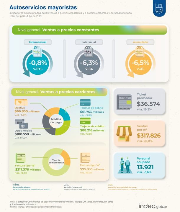 "En julio de 2025, el Índice de ventas totales a precios constantes muestra una disminución de 6,3% respecto a igual mes de 2024. El acumulado enero-julio de 2025 registra una caída de 6,5% respecto a igual período de 2024", informaron desde el INDEC.