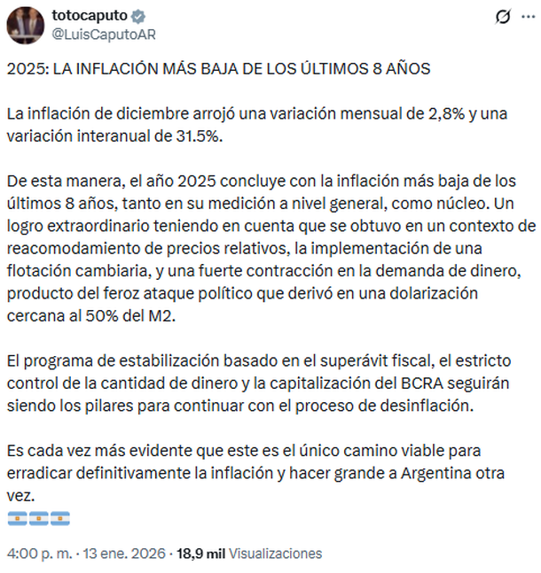 En redes sociales, el ministro de Economía destacó que la inflación de 2025 es "la más baja de los últimos 8 años".