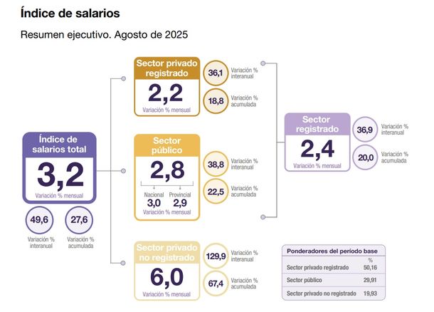 Muy atrás quedaron, aunque también levemente por encima de la inflación, los salarios del sector privado registrado (2,2%) y del Sector Público (2,8%). Así, los salarios registrados que incluyen privados y públicos, escalaron 2,4% promedio en agosto. Así y todo, acumulan una caída del 4,74% frente a la inflación acumulada desde noviembre de 2023, momento en el que asumió su cargo Javier Milei. En el caso de los haberes públicos acumulan una pérdida de 13,22% desde noviembre 2023.