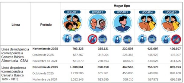 El mismo relevamiento oficial indicó que, para no quedar por debajo de la línea de pobreza, ese mismo grupo familiar necesitó reunir $1.308.061, un monto que representó un incremento del 2,3% respecto de octubre, cuando la canasta se ubicaba en $1.279.205. La suba, aunque moderada en términos mensuales, se da sobre valores ya muy elevados y consolida un escenario complejo para los ingresos fijos, en un marco de recesión y contención del consumo que atraviesa al país bajo la gestión de Javier Milei.