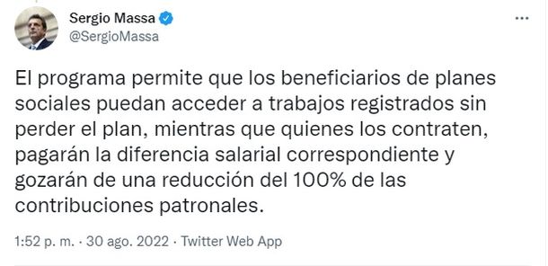 "Es clave que desde el Estado promocionemos la inclusión social a través del empleo para las personas en situación de vulnerabilidad social y económica, porque nuestra idea de país es que el plan sea la emergencia y el trabajo, lo permanente", señaló Massa en un mensaje que difundió a través de Twitter.