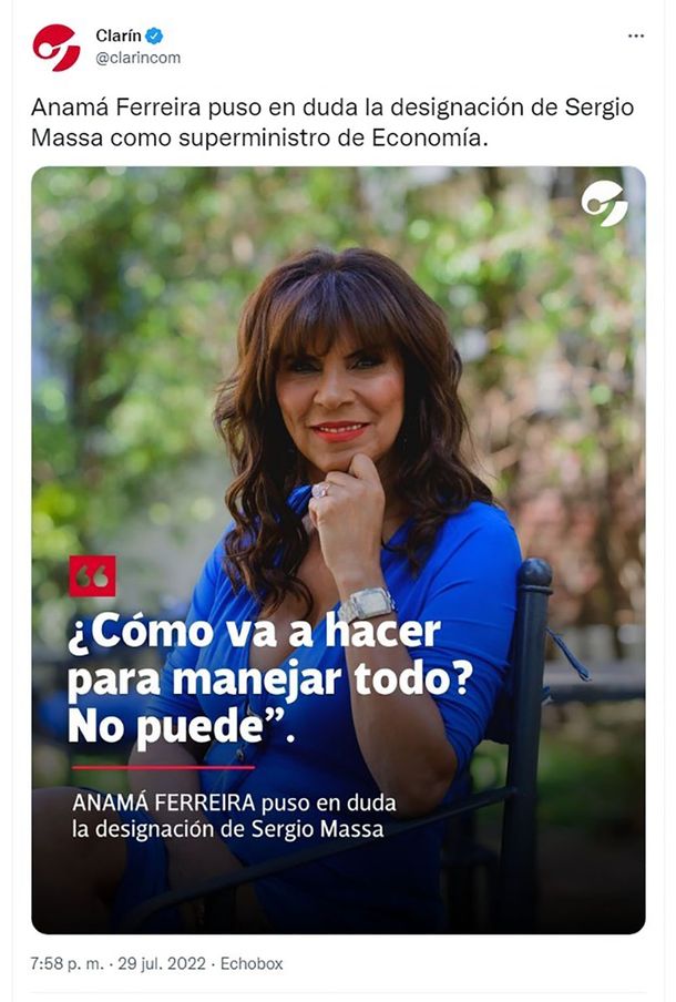 “Anamá Ferreira puso en duda la designación de Sergio Massa como superministro de Economía”, decía la publicación en Twitter, acompañada de la imagen de la exmodelo de origen brasileño con un entrecomillado: “¿Cómo va a hacer para manejar todo? No puede”.