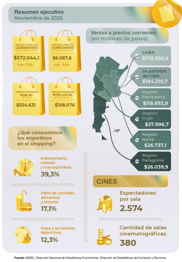 Finalmente, en los centros de compras (shoppings), las ventas aumentaron en la medición interanual (+17,3%) aunque disminuyeron contra octubre anterior (-2,3%), alcanzando los $572 millones a precios corrientes y $6.587 millones a precios constantes.