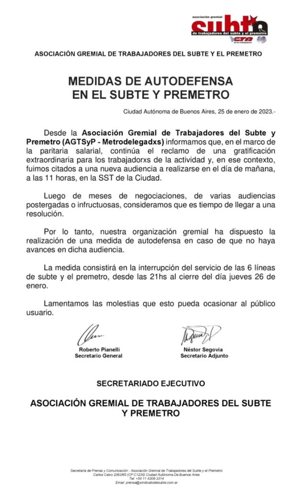 En se marco, advirtió que la "medida de autodefensa" se llevará a cabo en las seis líneas y el Premetro desde las 21 y hasta el cierre del servicio