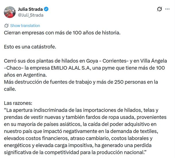 Y detalló: "Cerró sus dos plantas de hilados en Goya - Corrientes- y en Villa Ángela -Chaco- la empresa EMILIO ALAL S.A, una pyme que tiene más de 100 años en Argentina. Más destrucción de fuentes de trabajo y más de 250 personas en la calle".